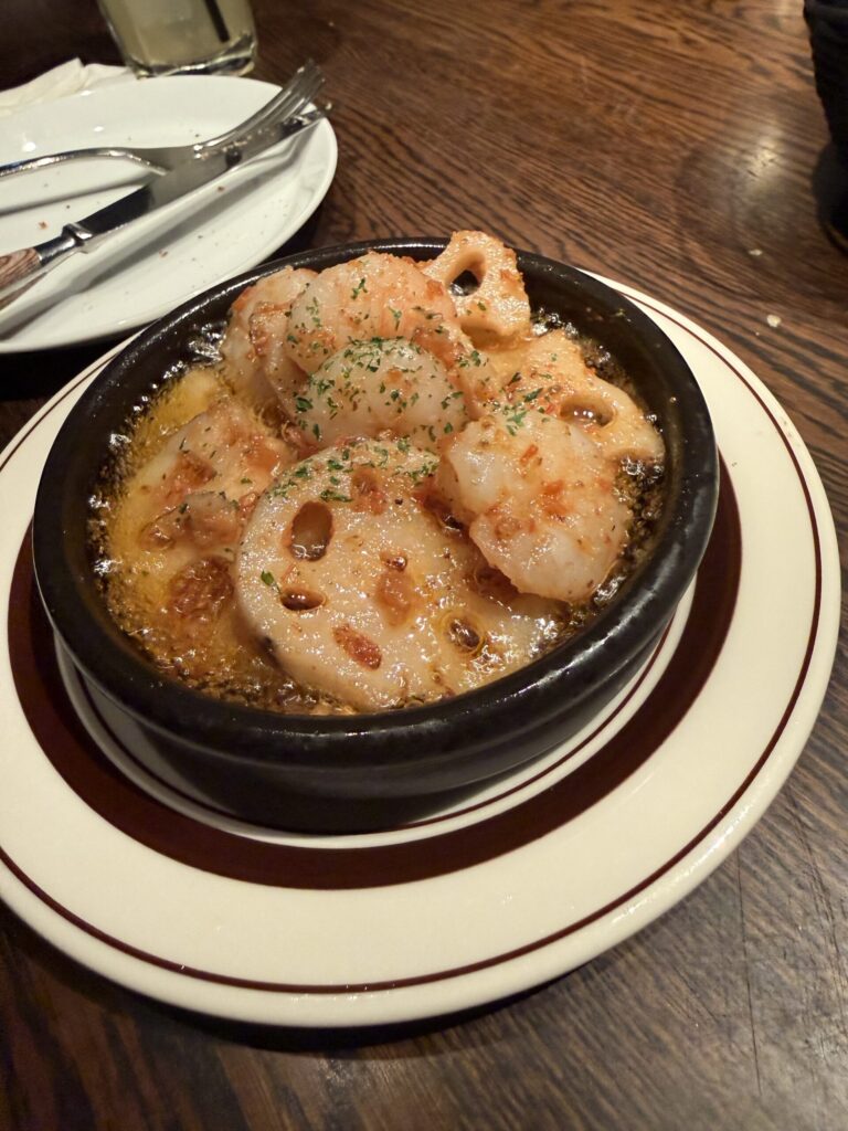 えびとレンコンのアヒージョは、ぜひ食べていただきたい一品です。レンコンは甘味だけ残して歯ごたえがほとんどないくらい柔らかくなっていました。