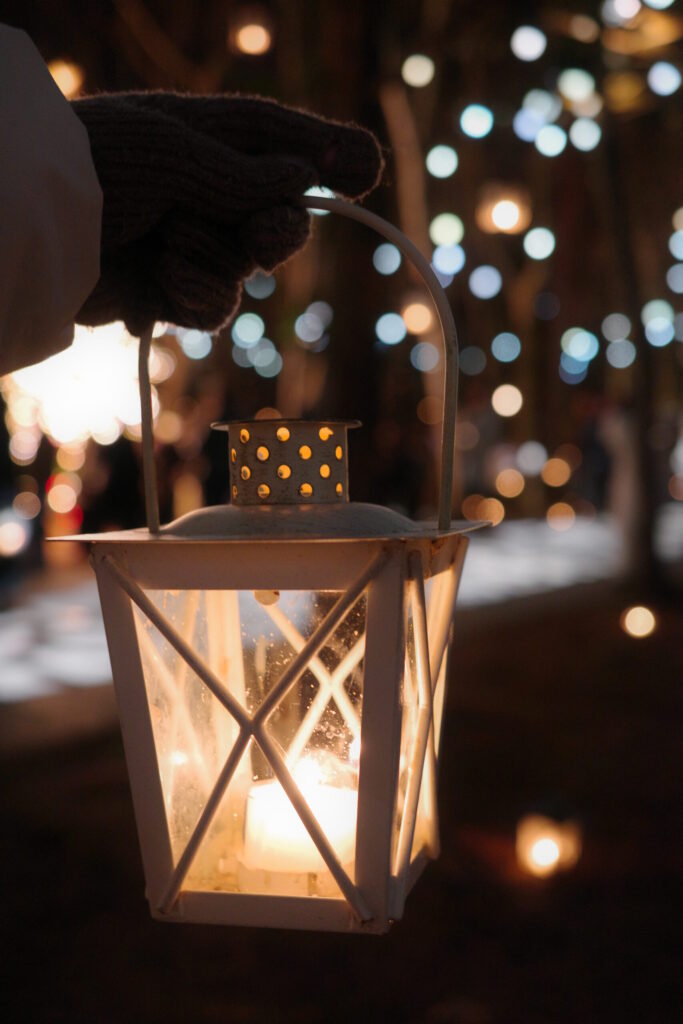 自然の中に佇む教会と、その周囲をイルミネーションが照らします。この幻想的な空間をランタンをもって散策するのが大人気のイベントです。