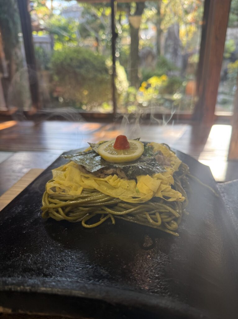 瓦そばは名前の通り瓦のうえに茶そばがのっている下関の伝統料理です。