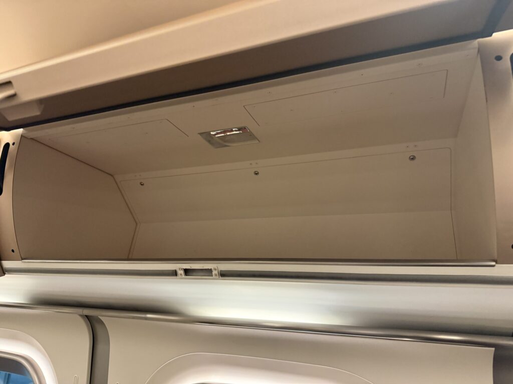 座席の上には、スーツケースでもしっかり十分に入りそうなほど大きな収納スペースが用意されています。飛行機のキャビネットがかなり近いです。