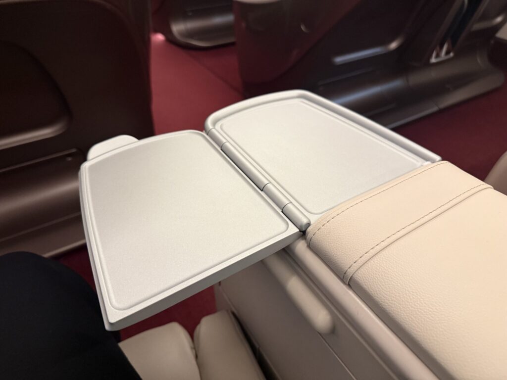 座席には、飲み物や小物などを乗せられる小さめのものと、食事がとれる大きめのものの2種類のテーブルがついています。