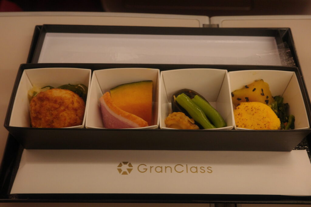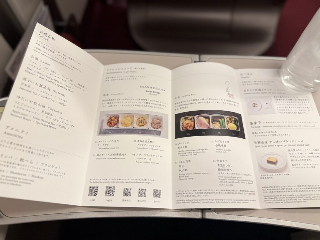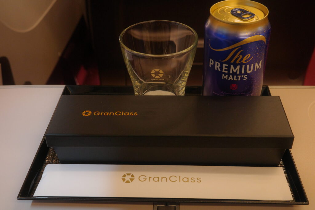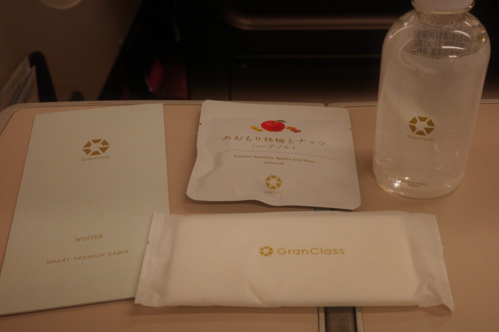 乗車して数分経つと、ウェルカムセットが配られます。中には、水、ウェットティッシュ、お菓子、メニューが入っています。