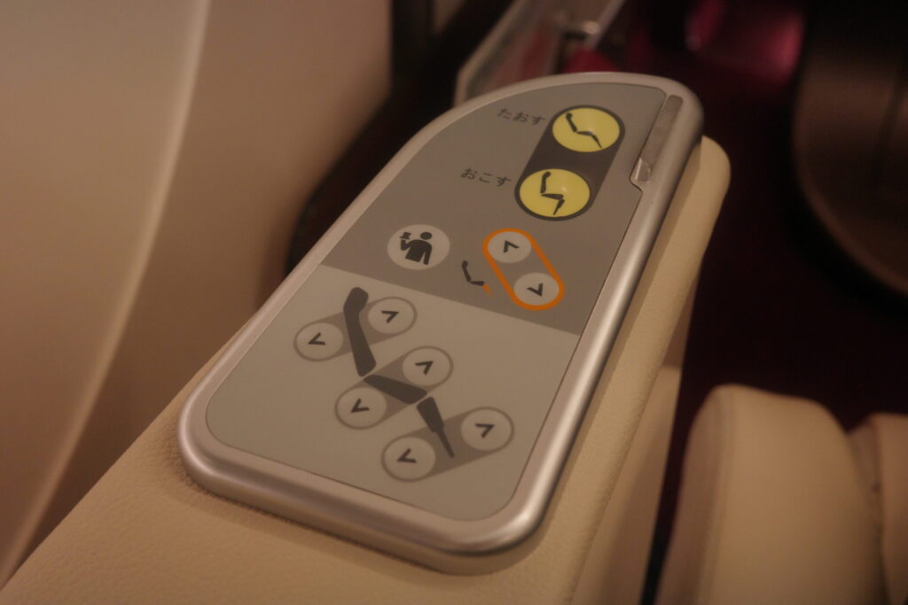 座席横についているボタンで、アテンダントの方を呼ぶことができます。飲み物のおかわりや、各種サービスのお願いもしやすく非常に快適でした。