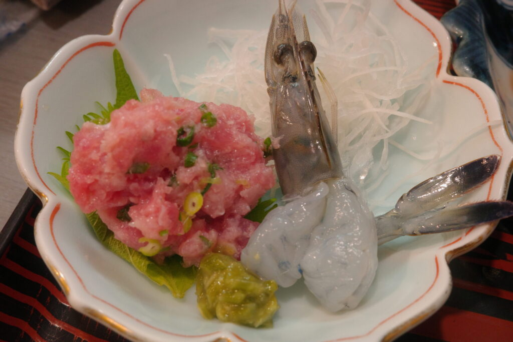 料理ですが、最初に用意されている鍋と小鉢だけでなく、後からネギトロとエビ、さらに豚しゃぶもありかなりボリューミーでした。4,000円でこのコスパは信じられないほど、量も質も兼ね備えた料理が次から次へと。